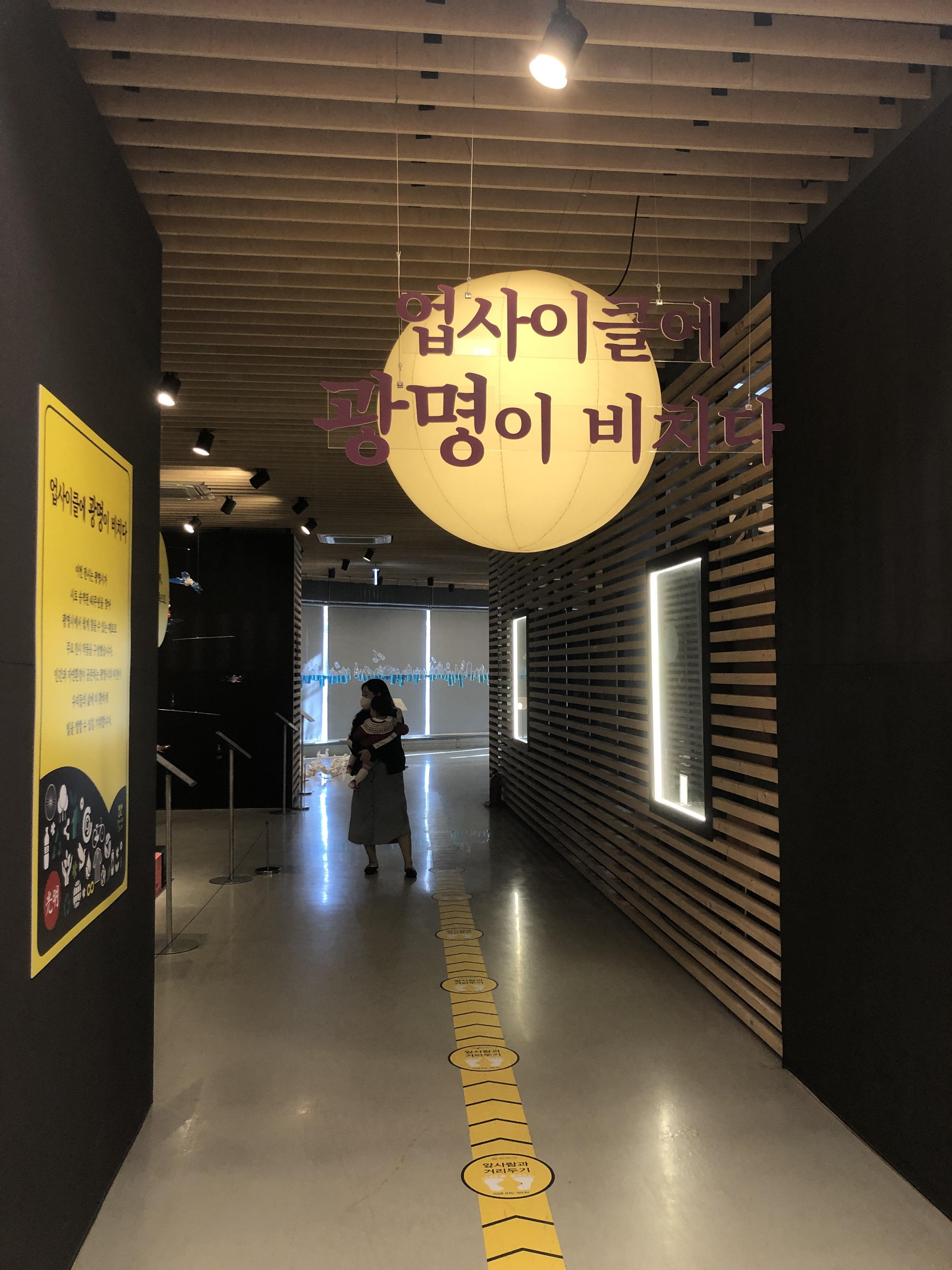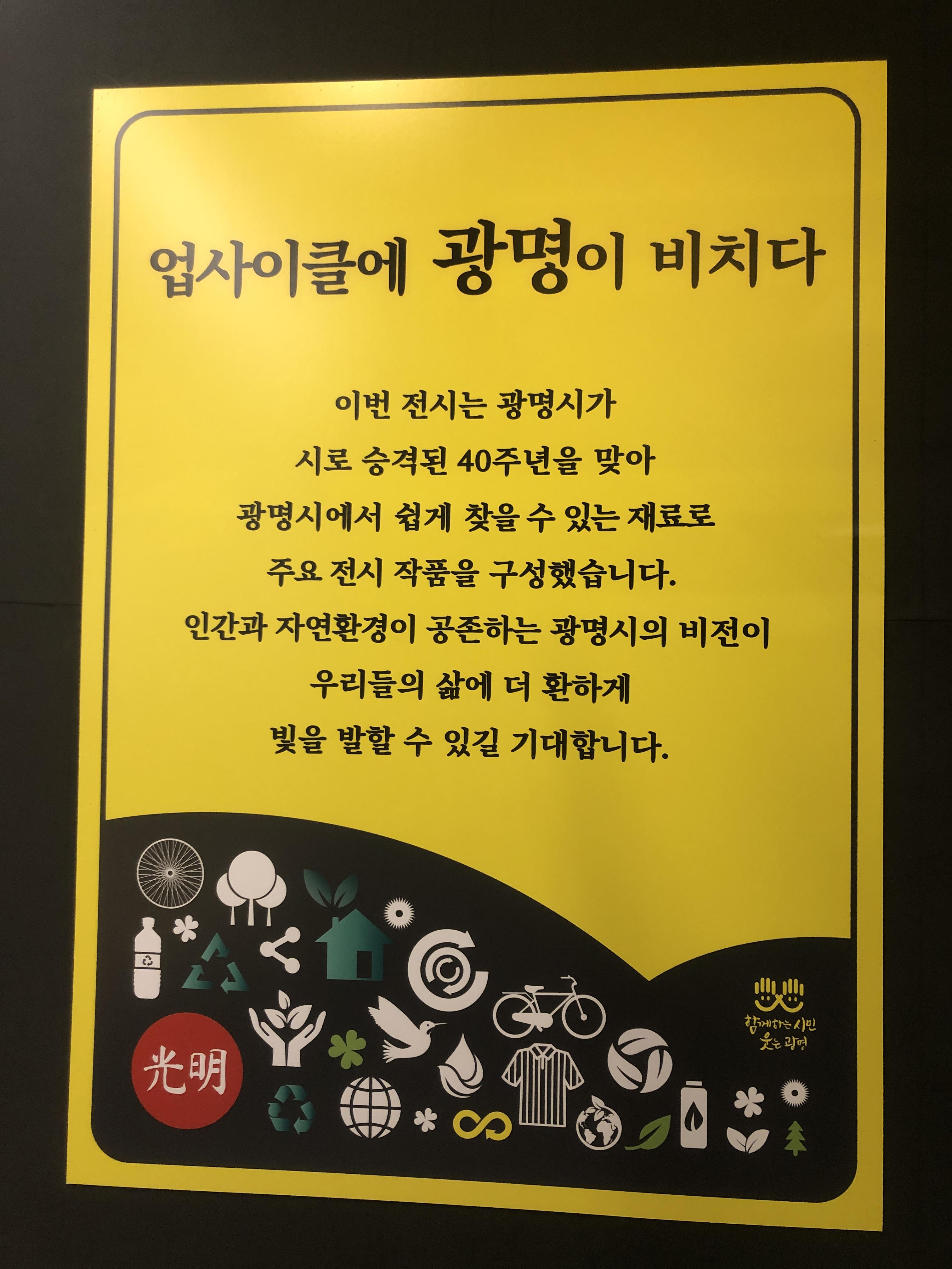 제가 갔을 때는 '업사이클에 광명이 비치다'라는 전시가 진행 중이었습니다. 광명시에서 나오는 쓰레기들로만 이루어진 업사이클링 작품 전시라고 합니다. 공간은 그렇게 크지 않았지만, 전시물은 나름 굉장히 훌륭했습니다. 전시 공간만 관람하신다면 여유롭게 관람하신다고 해도 30분 안에는 무조건 다 보실 수 있을 정도의 크기였습니다.